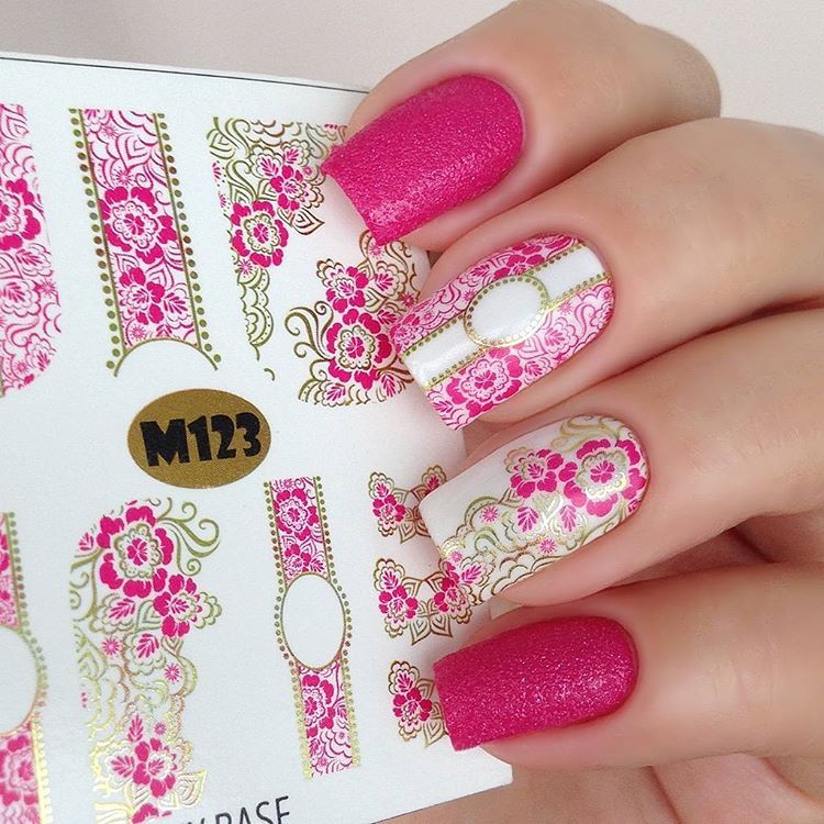 Золото покажет белый цвет совсем с другой стороны. Здесь более мягкая форма восприятия создаст ощущение роскоши и изысканности, в зависимости от выбора декора. Стоит совместить оригинальный узор из фольги и покрытие — дизайн удивит своей красотой. Гармонировать будут и золотые блестки, и оригинальные слайдер наклейки.