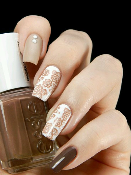 Изучая кофейный нейл-арт, я сама выпила пару чашечек кофе с молоком. Вытирая капли со стола, я придумала для вас бонусную идею. Можно нарисовать круглые следы от чашки на ноготках. Жаль только не удалось найти подобного маникюра в сети. Так что воплощайте скорее эту еще никем неиспробованную идею! А пока предлагаю изучить уже существующие образы для кофейного маникюра с кружком, очень похожим на след от чашки.Вот такой вот красивый и нежный вариант с прекрасным контрастом из коричневого и бежево-персикового цветов. Добавляем замысловатые узоры и праздничный акцент со стразами – вуаля! Получился шикарный и стильный нейл-арт.