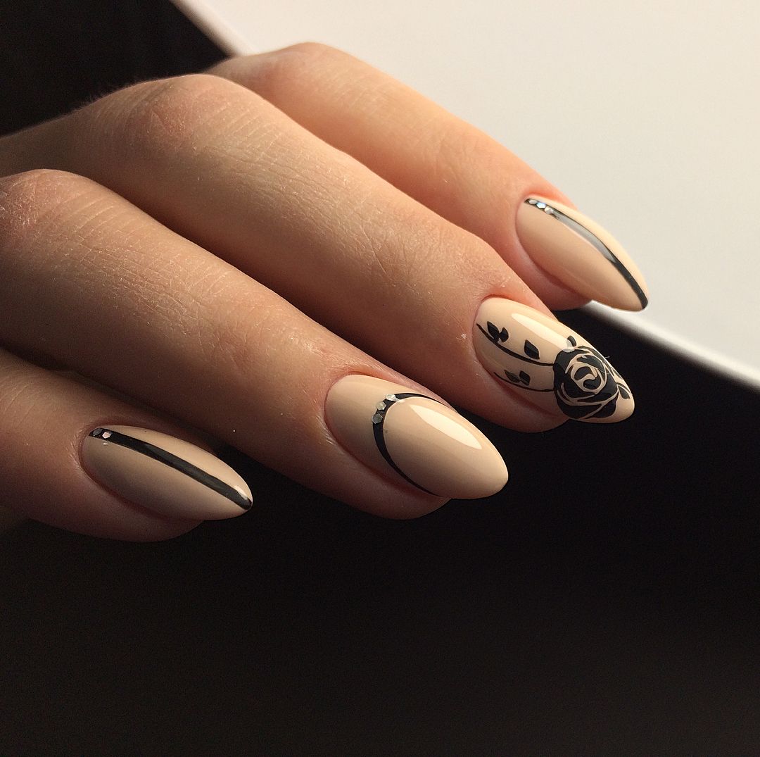 Стоит пояснить, что чаще всего бежевая база идет в комбинации с черным рисунком или узором. В этом случае все ногти покрываются нейтральным оттенком, а потом два или три пальчика украшаются изящным изображением. В этом случае уместно будет добавить и стразы – черный оттенок очень хорошо смотрится в дополнении с блестящими объемными элементами. Удачно данные оттенки будут «играть» в маникюре, совмещающем разные фактуры. Как правило, для покрытия берется бежевый матовый лак и черный глянцевый.