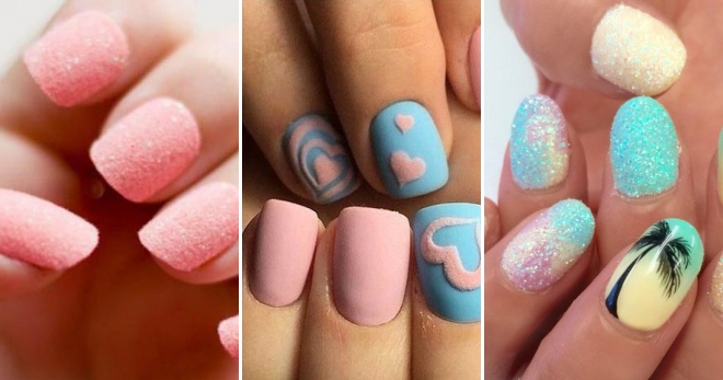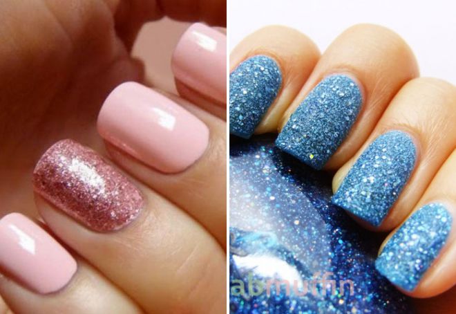 - могут быть применены самые разные цветовые комбинации, например, это может быть розовый маникюр с песком, голубой, желтый и другие тона;