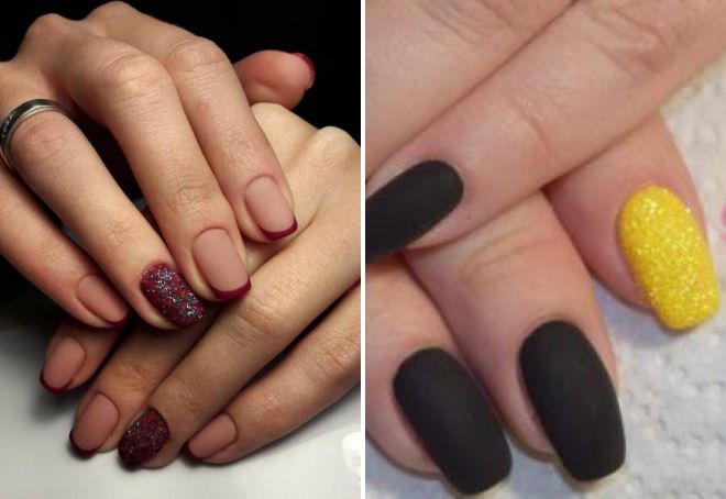 - на ногтевых пластинах может чередоваться матовое покрытие и бархатный эффект;