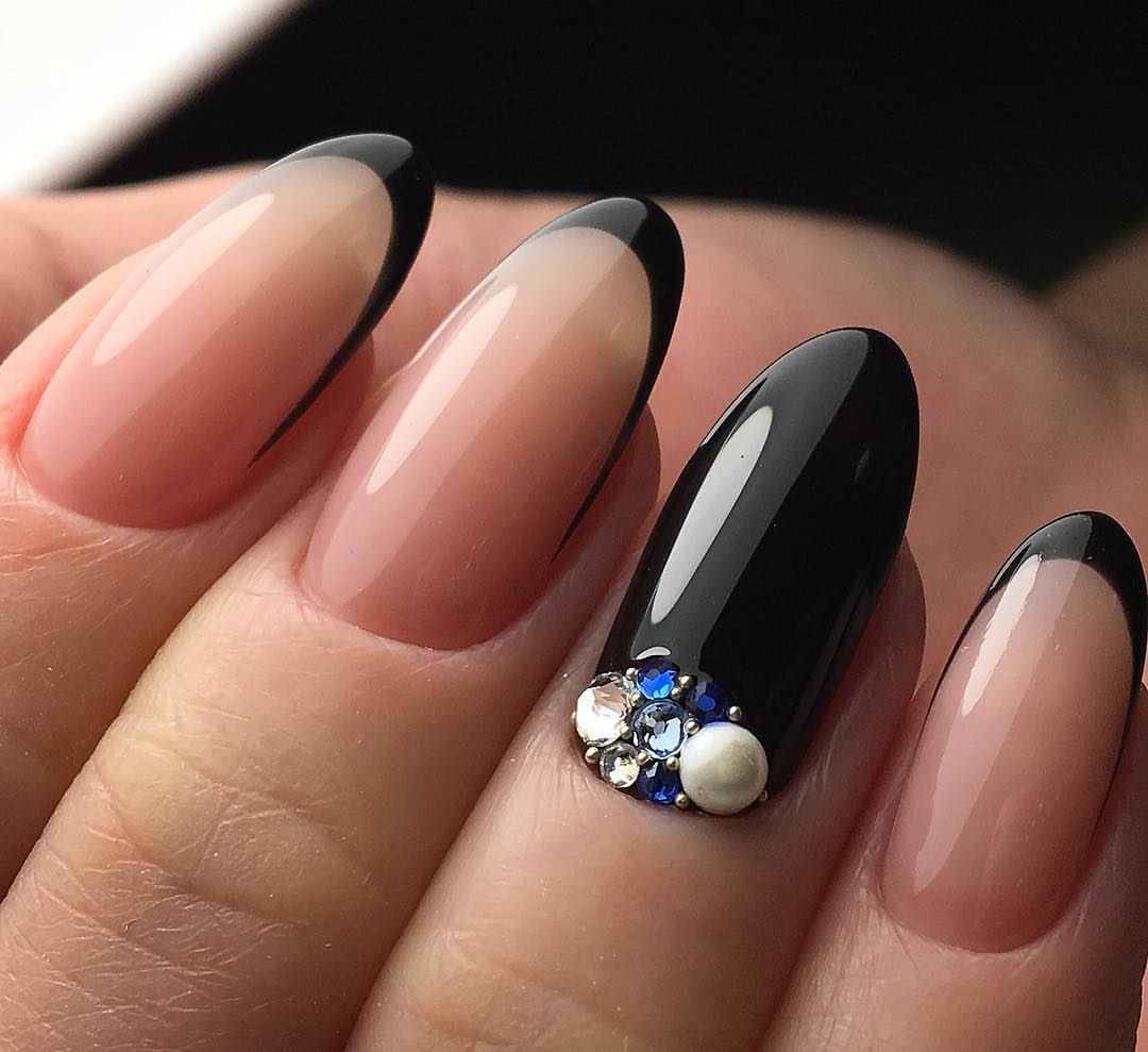 Стразы, прикрепляемые к ногтевой пластине, могут быть различного размера и цвета. При желании можно приклеить одну большую стразу или несколько маленьких. Потратив всего 15-20 минут свободного времени, в результате вы получите красивый и оригинальный френч в черном цвете со стразами.
