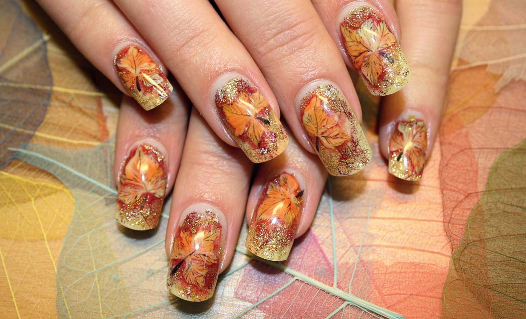 Рисунок можно не выполнять самостоятельно, а воспользоваться специальными слайдерами. Для декорирования лучше использовать только один – два пальца. - Предыдущий вариант можно оформить по-другому. Для этого один из ногтей (чаще всего на безымянном пальце) покрывают непрозрачным белым лаком, добиваясь эффекта фарфора. Затем на нем при помощи акриловой краски «лепят» объемные изображения листьев, которые затем расписывают подходящими оттенками. Получается стильно и очень благородно.