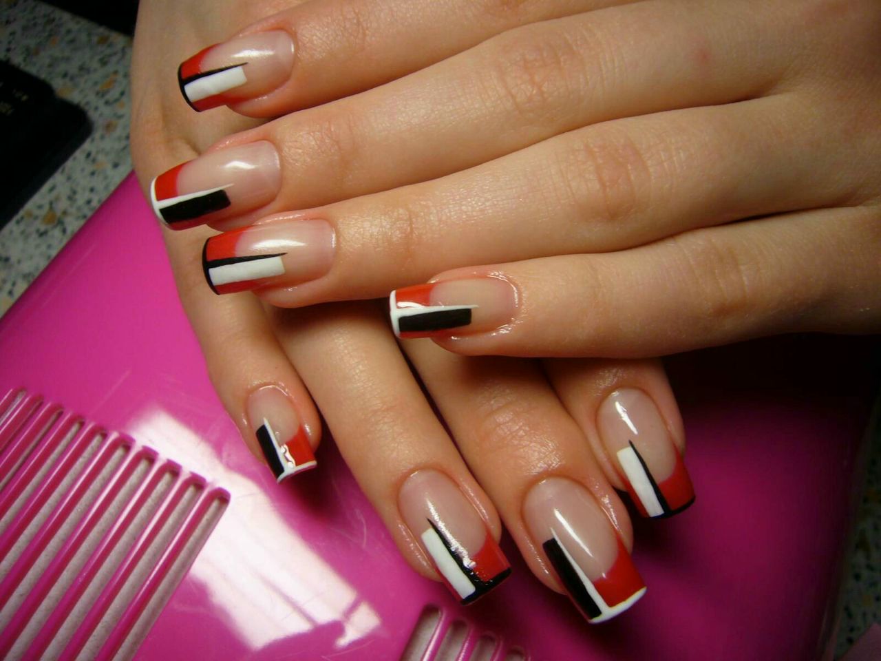 Работать с ними легко, они аккуратно ложатся на поверхность ноготков, имеют множество расцветок и размеров. В красно-черном френче можно использовать не только серебряные стразы. На красном фоне великолепно выглядят черные глянцевые стразы и бульонки. Великолепно выглядит сочетание красного, черного, белого и серебряного цвета. Важно не нагромождать маникюр обилием стразов и прочих камней. Они должны лишь аккуратно дополнять дизайн, а не быть его основным акцентом.