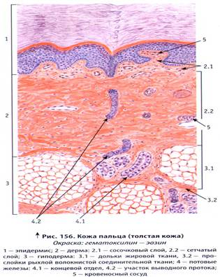 | КОЖА ПАЛЬЦА Окраска гематоксилин-эозином 1 — базальный слой эпидермиса | |