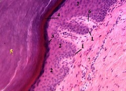 | КОЖА ПАЛЬЦА Окраска гематоксилин-эозином 1 — базальный слой эпидермиса 7 — сетчатый слой дермы | |
